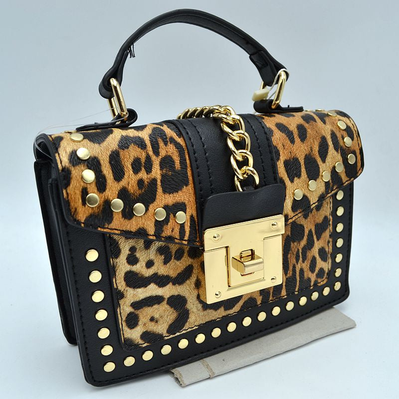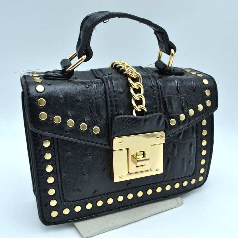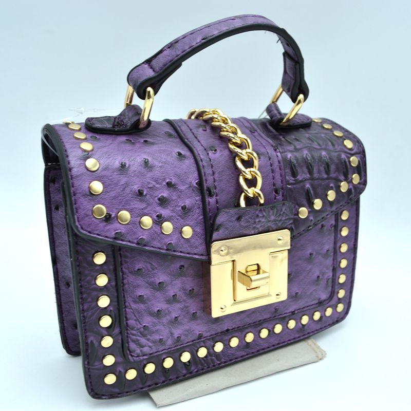 Textured Vegan leather material with beautiful gold detail. Spin Knob Closure