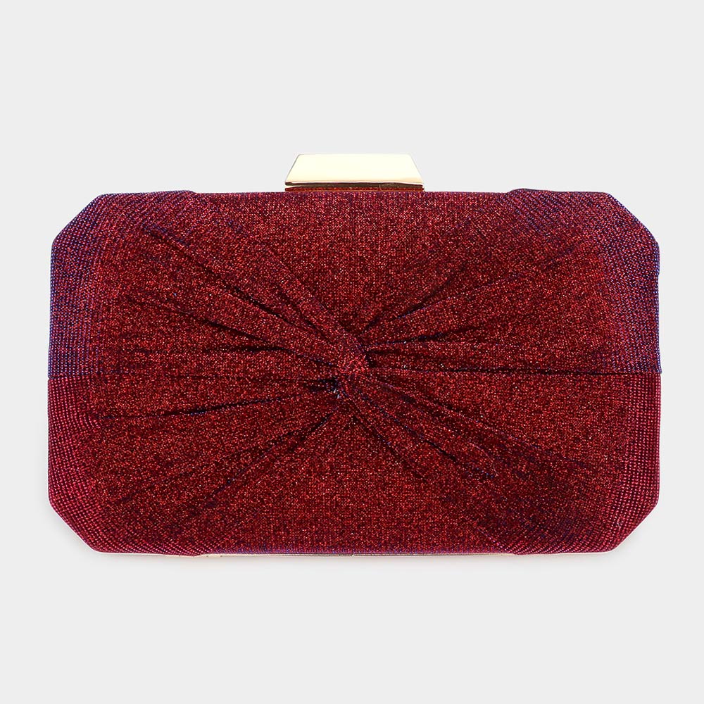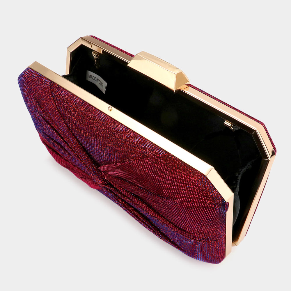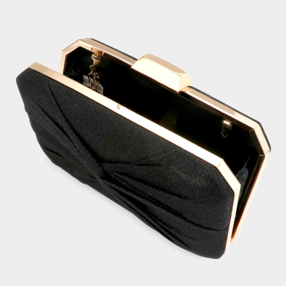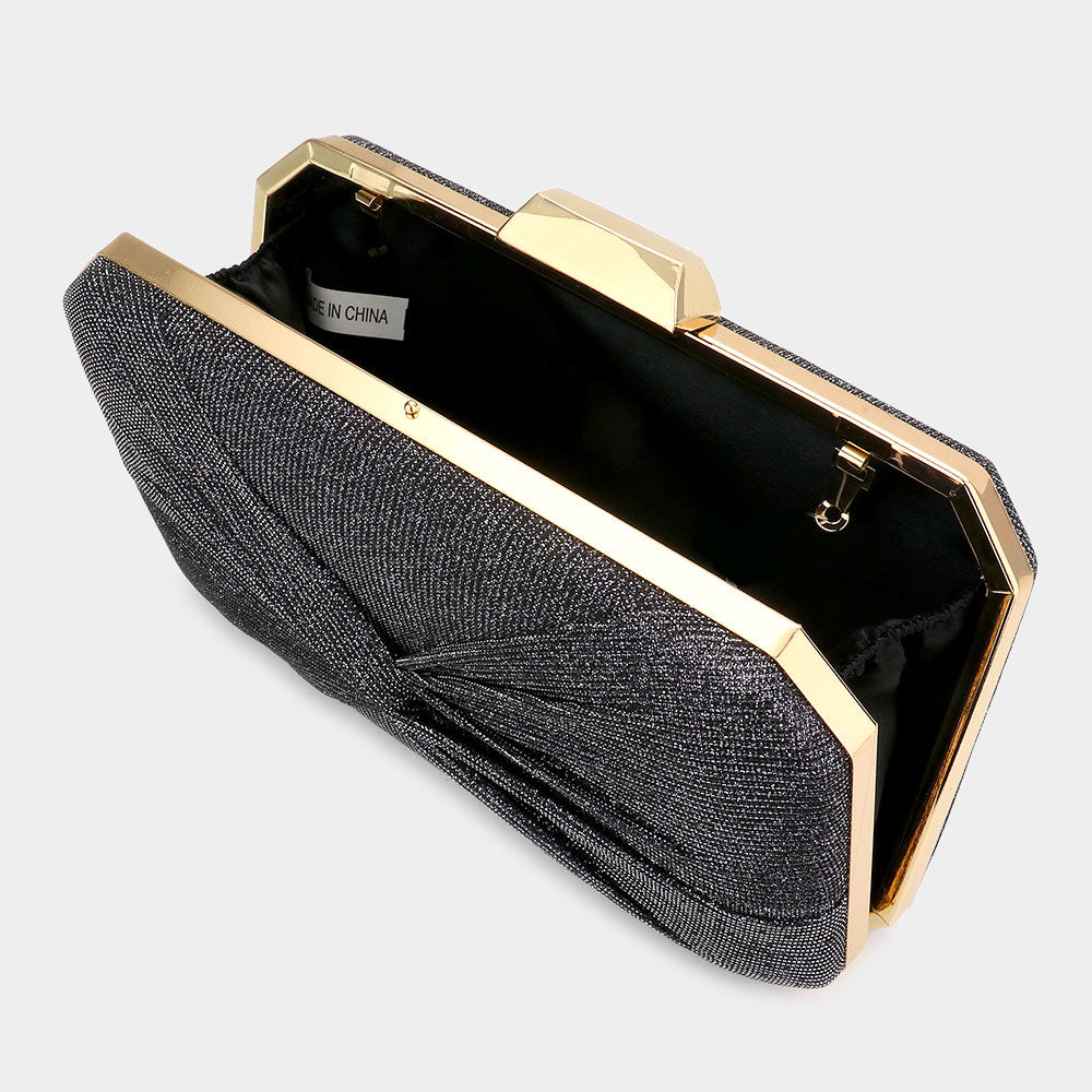 Glitter evening clutch with fabric twist detail and removable shoulder strap.