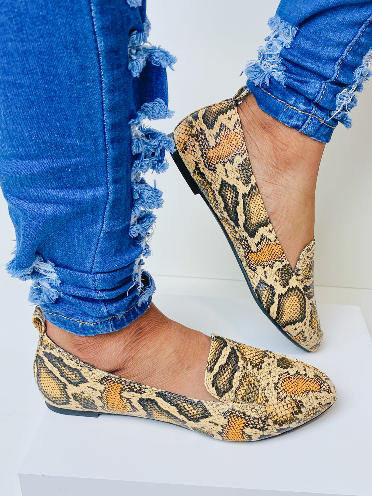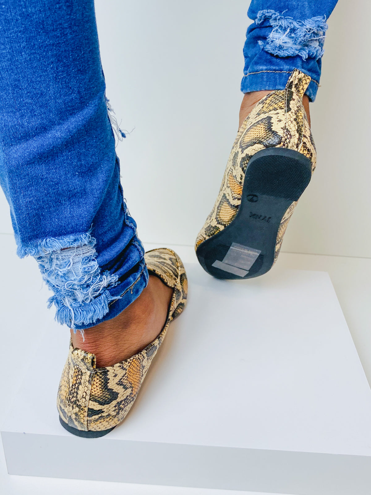 Our "Faith" Faux Snake Skin Flats has that extra statement you need in your flats