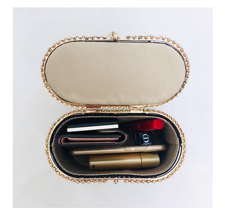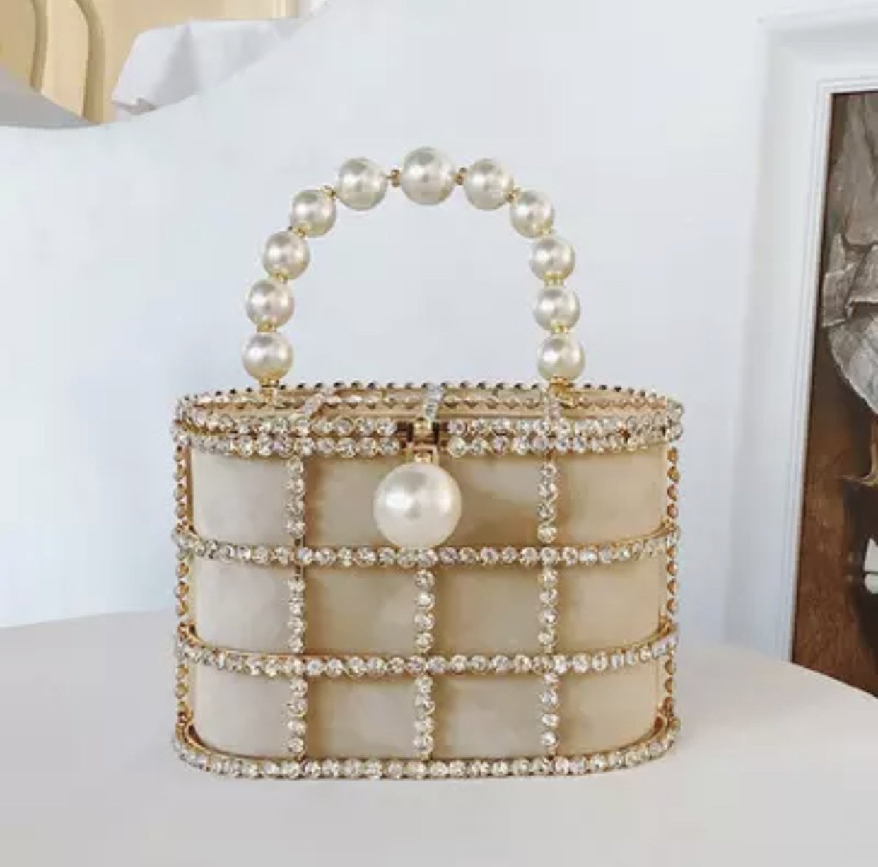 Our "Rosaline" Jeweled Cage Handbag features jewels and pearls all over, with a suede box material for the inner piece.